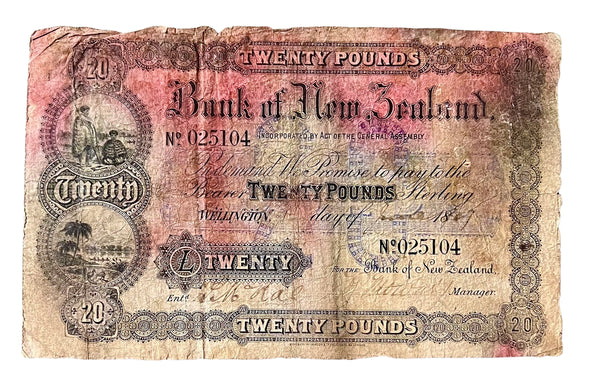 Bank of New Zealand. Third Issue £20. Printed date of 18__ but hand dated overprint ( est 1 June ) 1907. Wellington domicile. P.S194.