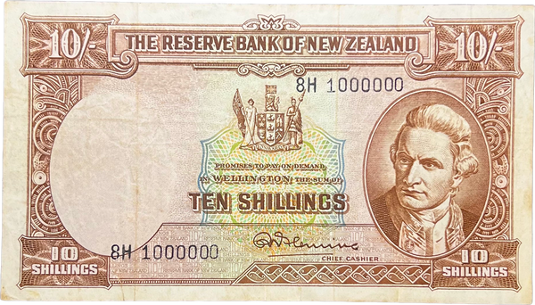 New Zealand. 1956- 1967 Ten Shillings. Fleming. Serial One Million 8H 1000000. Tear on the bottom left margin. Ex Nobles Sale 118. P.158d