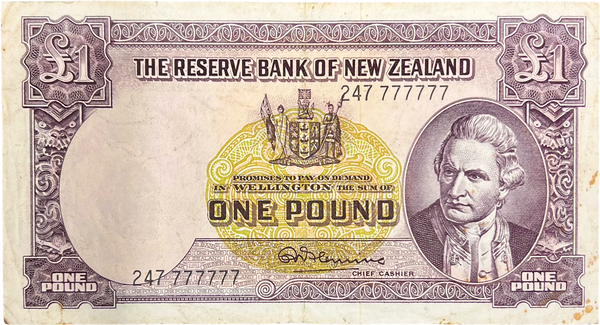 New Zealand. 1956- 1967 One Pound. Fleming. Solid 7s Serial Number 247 77777. P#159d