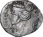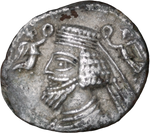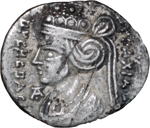 Kingdom of Parthia. Queen Thea Musa and King Phraatakes. c.2 BC - 4 AD Drachm. Diademed bust of Phraatakes left; Nikai flying right before, and left behind, crowning him / MOVCHC BACIΛ[ICCHC] to left, ΘΕΑCOY PANI[AC] to right, crowned bust of Musa right; monogram below chin; quadrate Os and Cs in legend. Ekbatana mint. Ex Nobles 85. Sellwood 58.9
