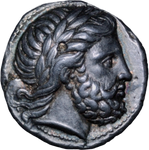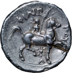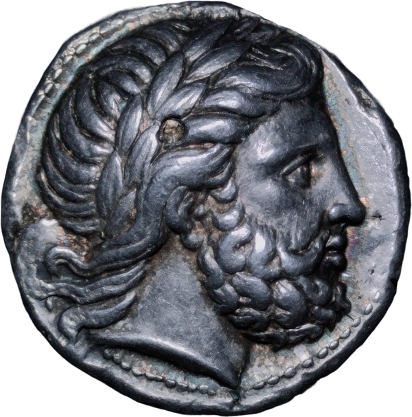 Kingdom of Macedonia. Philip II. 338-328 BC Tetradrachm. Bearded, laureate head of Zeus r. Rev. ФІЛІП - OY Youth, nude, on horseback r., holding reins with his I. hand, palm branch in his r. hand; below, star and lambda; all within linear circle. Pella mint. SNG ANS 411 var ( with Lambda ).