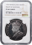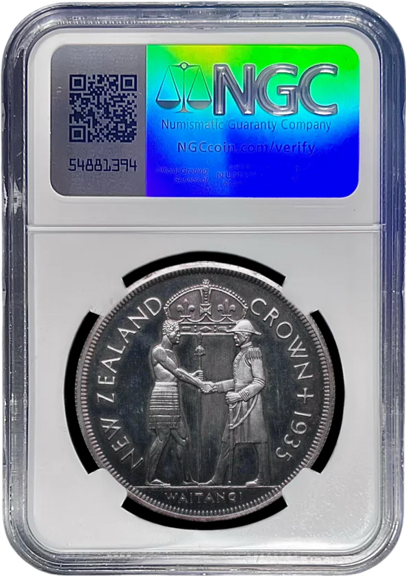 The Waitangi Crown is widely recognized as New Zealand's Most Iconic Coin, depicting the signing of the Treaty of Waitangi on February 6th 1840. It features Ngāpuhi Māori chief Tāmati Wāka Nene and British Governor William Hobson clasping hands beneath a crown—along with the words "NEW ZEALAND CROWN 1935 WAITANGI". On the obverse, a portrait of King George V, inscribed with "GEORGE V KING EMPEROR".
