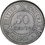 British Honduras. Edward VII. 1907 50 Cents. Low mintage of 19,000. Ex Nobles Sale 85 ( sold $600 AUD ), Superior California June 1996, from the Irving Goodman Collection. KM#13