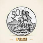50 Cents: Endeavour: The HMS Endeavour, the ship Captain Cook sailed on during his first arrival in New Zealand, is depicted with Mount Taranaki in the background.